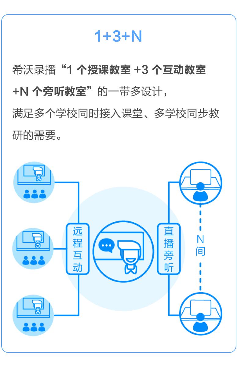 個授課教室 個互動教室 個旁聽教室”的一帶多設(shè)計,滿足多個學校同時接入課堂、多學校同步教研的需要。老師足不出校,即可同步教研,實現(xiàn)了教學教研“齊步走”。