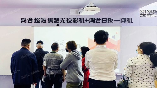 此外,鴻合展區(qū)還呈現(xiàn)了“鴻合超短焦激光投影機(jī)+白板一體機(jī)”這一解決方案。值得關(guān)注的是,鴻合高職教白板一體機(jī)在本次高博會(huì)首次亮相,超大尺寸,滿足高校各類學(xué)科精準(zhǔn)色彩還原需求,超短距離投射更大畫幅的同時(shí),新增兩側(cè)黑板,全幅面支持水性筆書寫,課上教師不再拘泥,盡情揮灑創(chuàng)意。